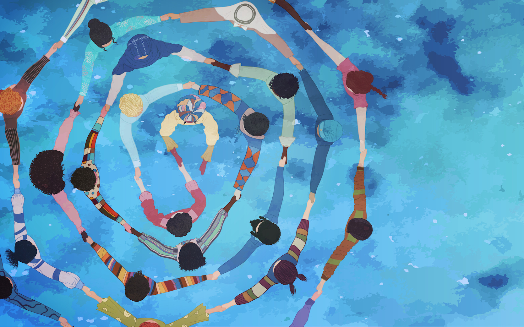 Group people in circle from diverse culture holding hands.Teamwork and cooperation.Community of friends or volunteers committed to social issues for peace and the environment.Top view.Equal