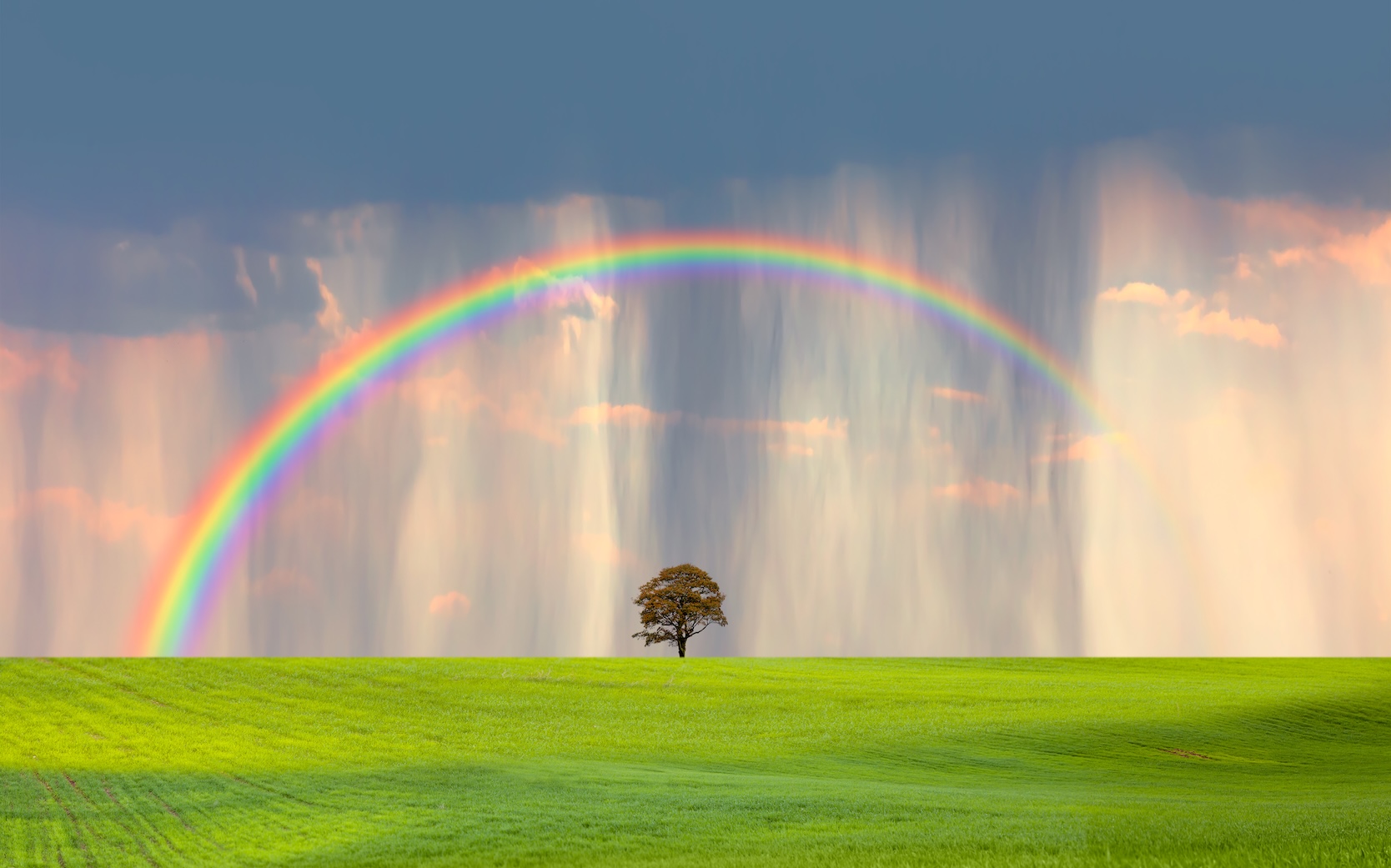 Rainy weather with green grass field and deep blue sky amazing rainbow in the background