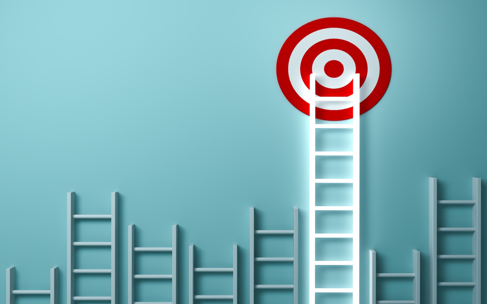 Stand out from the crowd and different creative idea concepts , Longest light ladder glowing and aiming high to goal target among other short ladders on green background with shadows . 3D rendering.