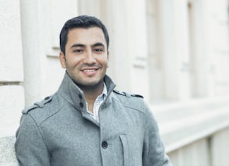 Close-up of a happy smile man wearing coat, coldly morning. Autmn day