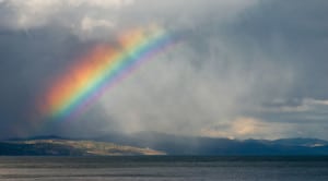 A rainbow breaks through the storm clouds