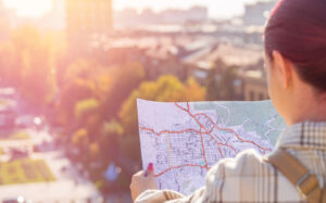 A tourist looks at a map to find his way around the city.