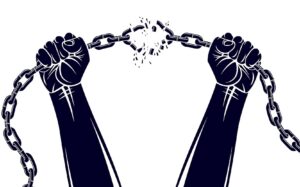 Strong hand clenched fist fighting for freedom against chain slavery theme illustration, vector logo or tattoo, getting free, struggle for liberty.