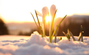 Beautiful crocuses growing through snow. First spring flowers
