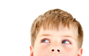 Handsome blond boy looking into the corner. Close-up portrait with copyspace for text. Isolated on white.