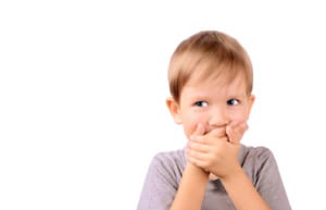 cheerful boy 5 years shut by the hands mouth. Horizontal Image isolated on white background