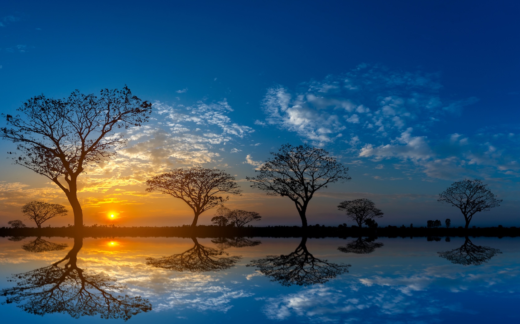 Panorama silhouette tree in africa with sunset.Tree silhouetted against a setting sun reflection on water.Typical african cool light sunset with acacia trees in Masai Mara, Kenya.