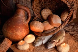 Miracle of bread and fish April 27, 2014 | No comments yet Two fish and five loaves of bread with candle-light and an antique wine jar