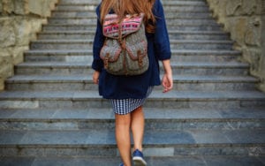 Student girl with a backpack climbing stairs