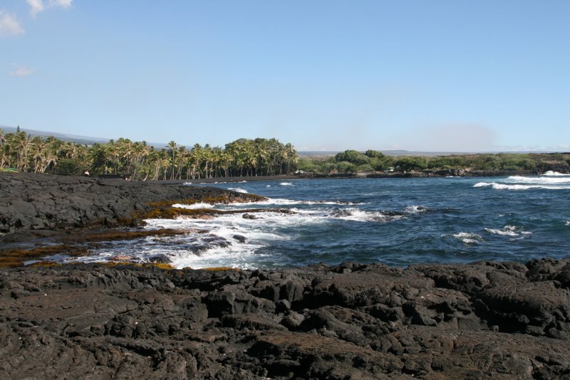 We then drove the 17-mile Crater Rim Road down to the ocean, a 4,000 plus foot descent. There were spectacular scenes of massive lava fields and views of the ocean from on high to absorb all the way down. As you can see, it’s difficult to find many sandy beaches on the Big Island. They are few and far between!