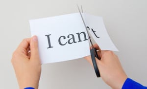 Female hand cutting paper with words. Concept.