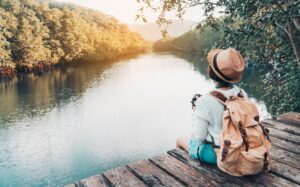 Cute girl backpacking and sitting on the wood plank resting and looking on the river. June 1, 2025 | Comments are closed.