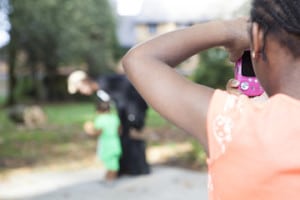 Child taking picture of mother and sister April 30, 2015 | No comments yet School girl of African descent outdoors with kids camera
