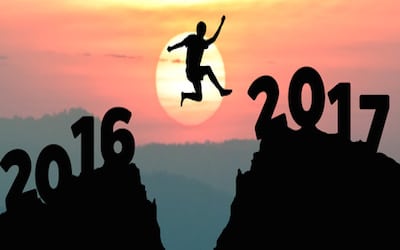 silhouette man jumps to make the word Happy New Year 2017 with sunrise. (New Year 2017 is coming concept.)