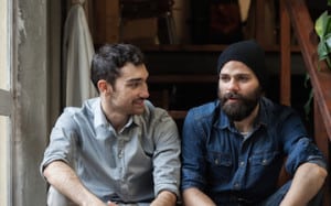 Couple of young men talking on the stairs of an office
