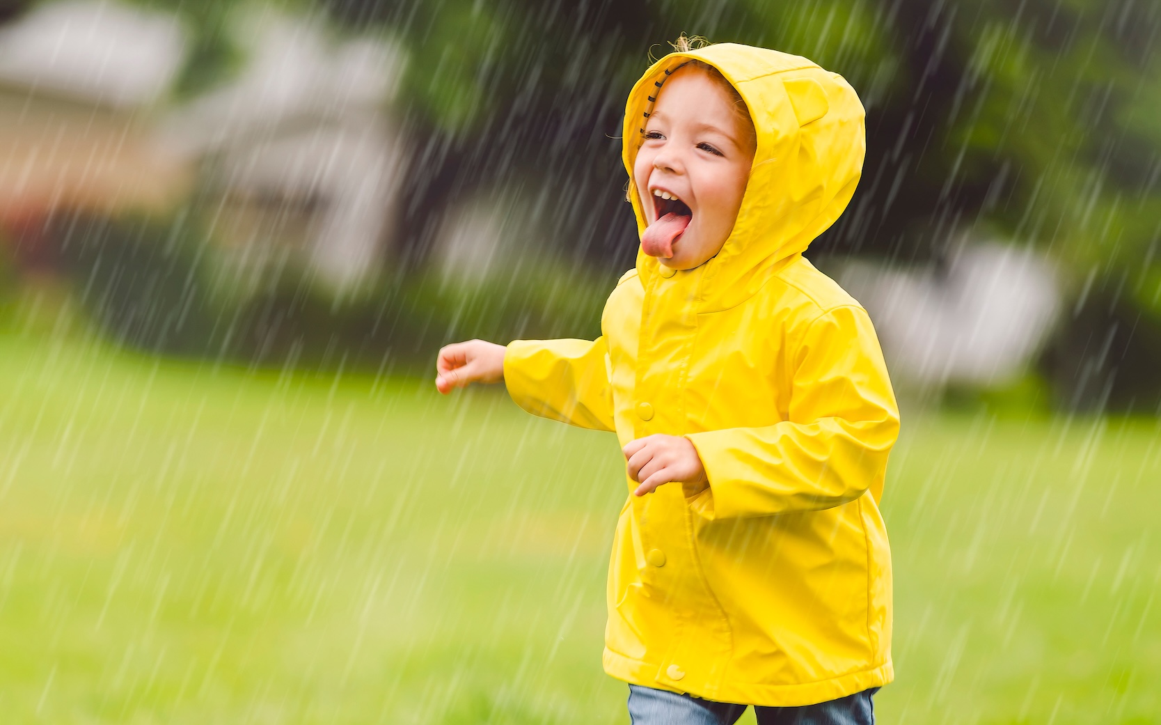 Happy funny child with raincoat under the summer raining day