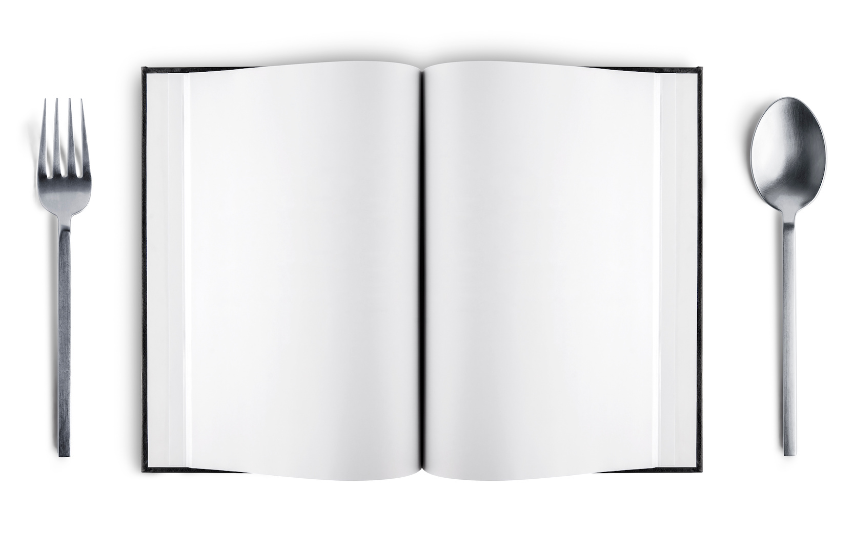 open book, fork and knife reading and food concept