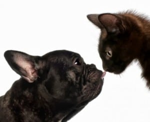 Close-up of a French bulldog licking the kitten’s nose against white background