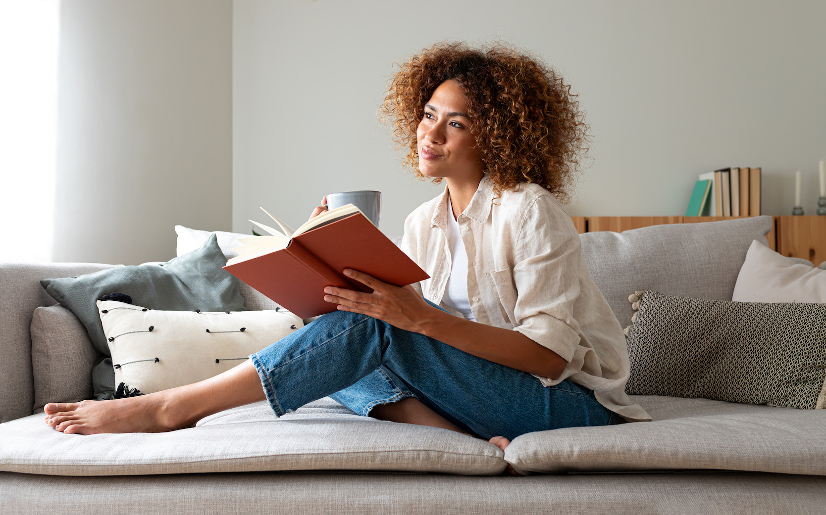 Pensive relaxed African american woman reading a book at home, drinking coffee sitting on the couch. Copy space.