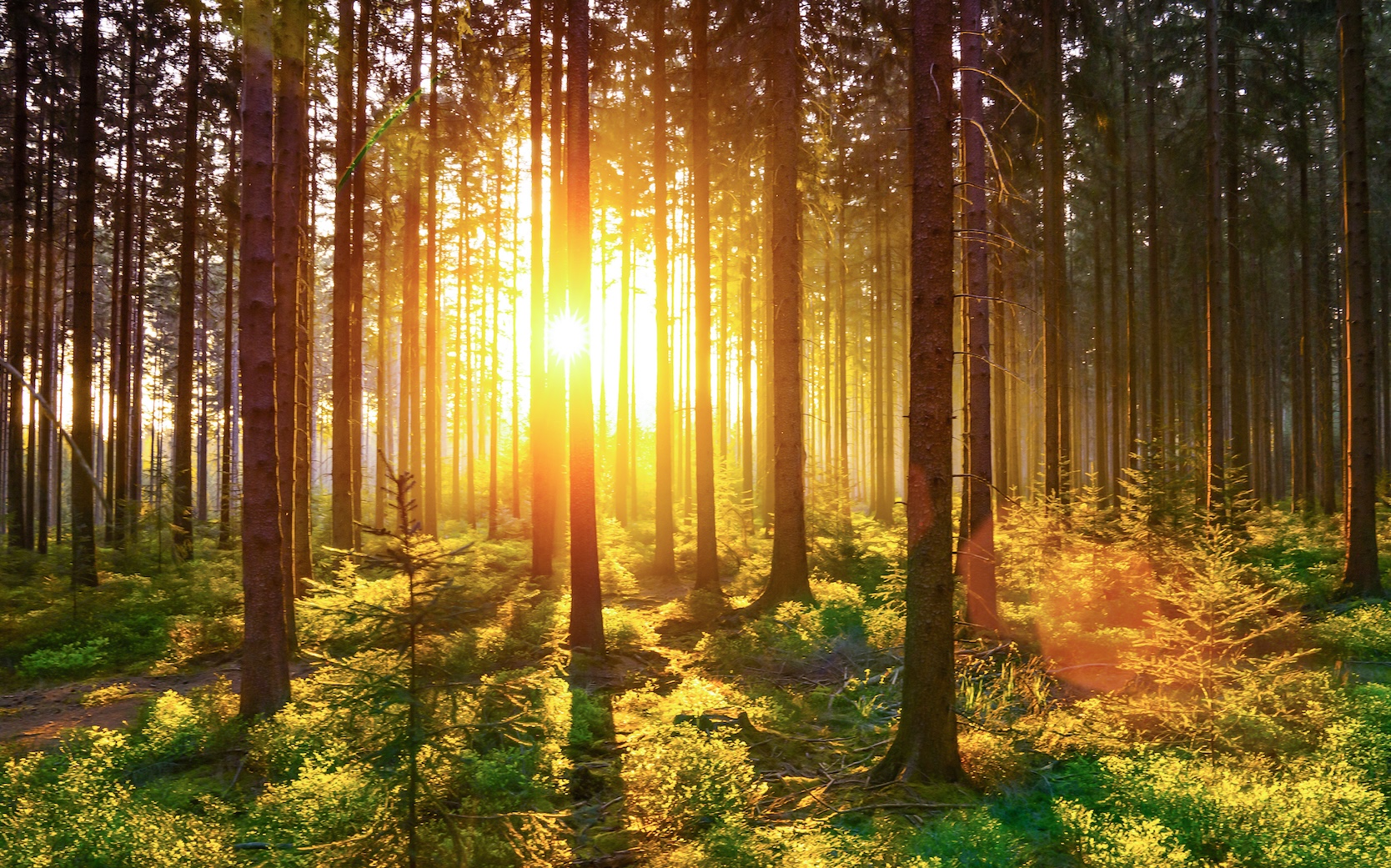 Silent Forest in spring with beautiful bright sun rays