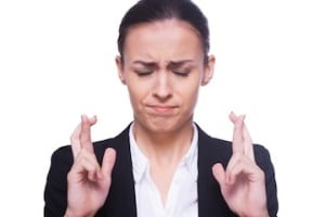 Waiting for special moment. Young woman in formalwear and keeping her fingers crossed and eyes closed while standing isolated on white January 10, 2015 | No comments yet