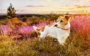 Dog puppy listening in a herbal lavender field