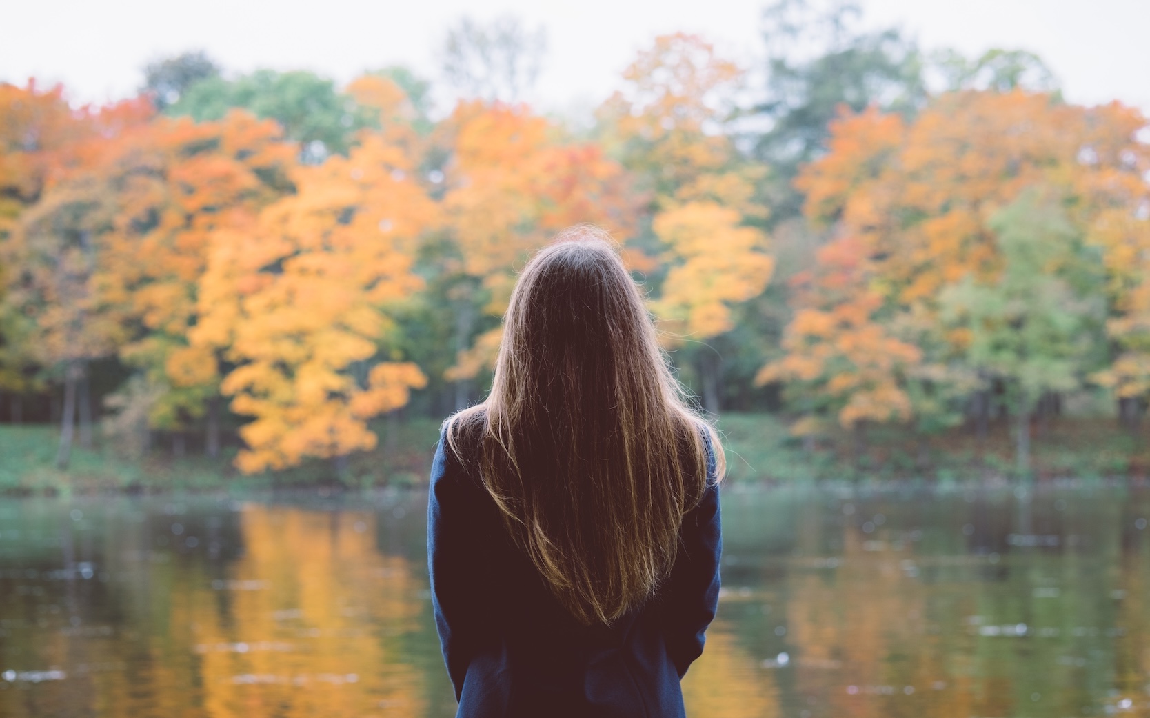 Outdoor autumn portrait of girl standing backwards with straight hair. Back view of woman explores calm lake and forest nature at fall. Image toned with old film style filters
