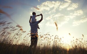 father and son in the park. father’s day silhouette happy family child dream concept. father carries his son on his back. dad playing with his son in nature in the park silhouette at sunset lifestyle