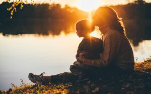 Mom and son sitting by the lake at the sunset.