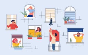 People in windows spaces home with different types of window treatments: curtains, shades, blinds. Neighbors living in apartment building, talk on phone, drink coffee and rest Flat vector illustration